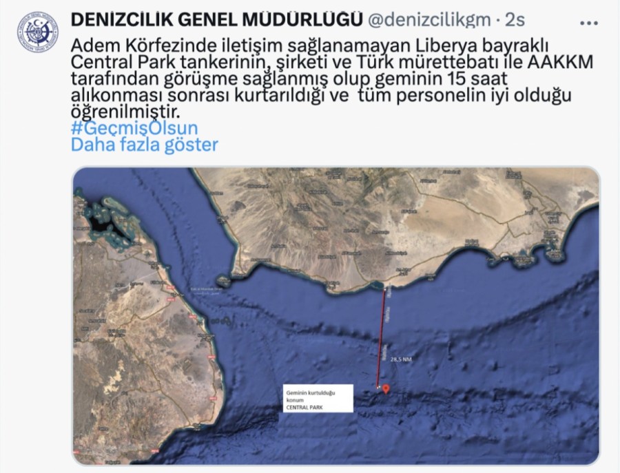 Denizcilik Genel Müdürlüğü sosyal medya hesabından yapılan açıklamada, "Aden Körfezi'nde iletişim sağlanamayan Liberya bayraklı Central Park tankerinin, şirketi ve Türk mürettebatı ile Ana Arama Kurtarma Koordinasyon Merkezi (AAKKM) tarafından görüşme sağlanmış olup geminin 15 saat alıkonması sonrası kurtarıldığı ve tüm personelin iyi olduğu öğrenilmiştir" ifadeleri kullanıldı.