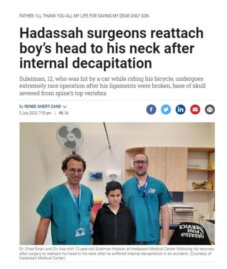 Batı Şeria bölgesinde yaşayan on iki yaşındaki Filistinli Süleyman Hassan'ın geçirdiği Trafik kazası sonrası neredeyse yerinden kopan kafası başarılı bir operasyonla yeniden vücuduna dikildi.
