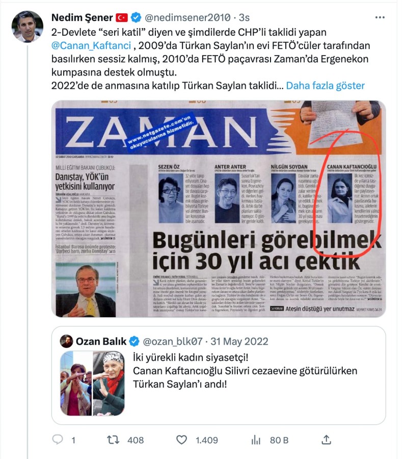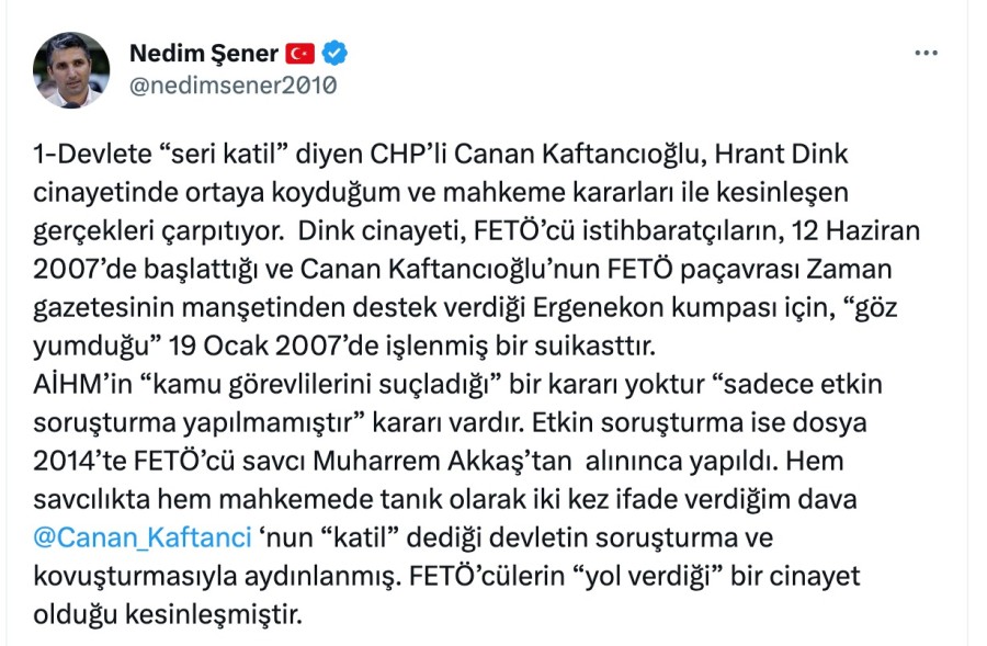 "Devlete 'seri katil' diyen CHP'li Canan Kaftancıoğlu, Hrant Dink cinayetinde ortaya koyduğum ve mahkeme kararları ile kesinleşen gerçekleri çarpıtıyor. Dink cinayeti, FETÖ'cü istihbaratçıların, 12 Haziran 2007'de başlattığı ve Canan Kaftancıoğlu'nun FETÖ paçavrası Zaman gazetesinin manşetinden destek verdiği Ergenekon kumpası için, 'göz yumduğu' 19 Ocak 2007'de işlenmiş bir suikasttır.