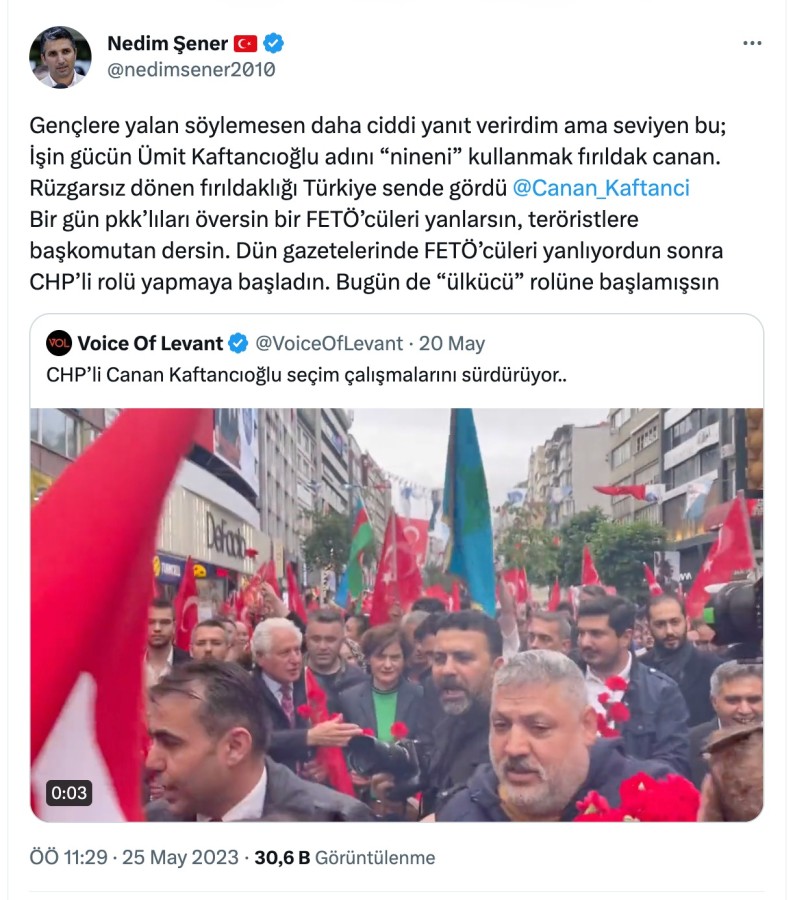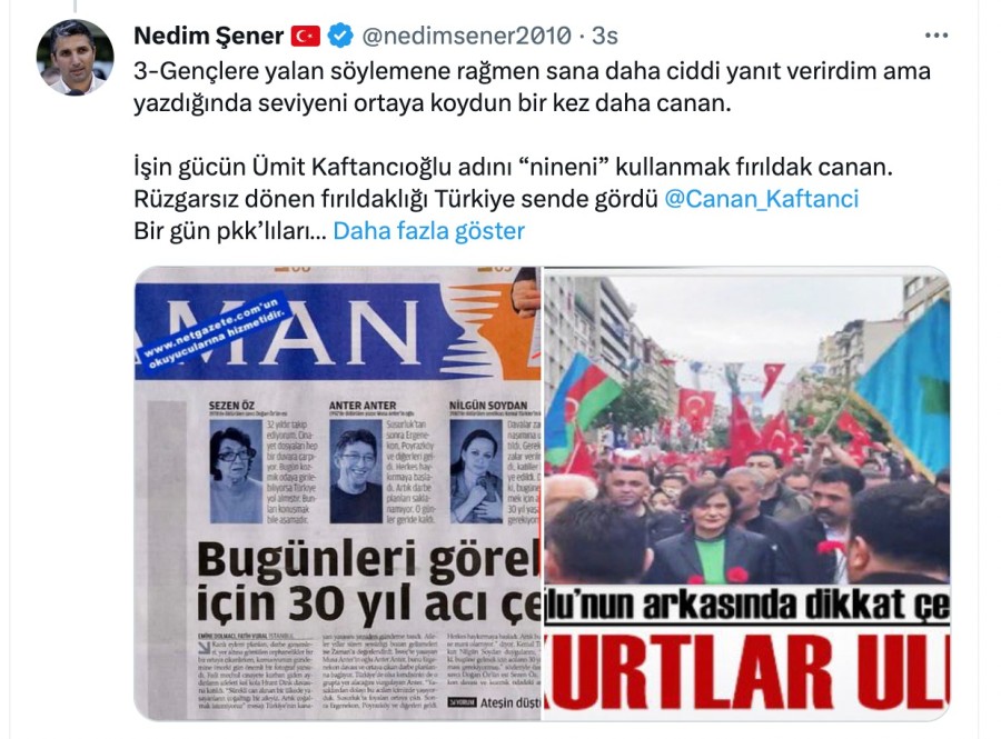 "Gençlere yalan söylemesen daha ciddi yanıt verirdim ama seviyen bu; İşin gücün Ümit Kaftancıoğlu adını "nineni" kullanmak fırıldak canan. Rüzgârsız dönen fırıldaklığı Türkiye sende gördü @Canan_Kaftanci Bir gün PKK'lıları översin bir FETÖ'cüleri yanlarsın, teröristlere başkomutan dersin. Dün gazetelerinde FETÖ'cüleri yanlıyordun sonra CHP'li rolü yapmaya başladın. Bugün de "ülkücü" rolüne başlamışsın."