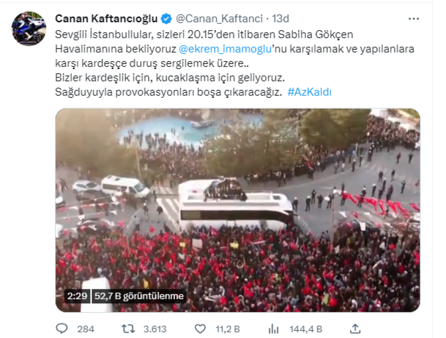 Twitter hesabından paylaşım yapan Kaftancıoğlu, "Sevgili İstanbullular, sizleri 20.15'den itibaren Sabiha Gökçen Havalimanına bekliyoruz Ekrem İmamoğlu'nu karşılamak ve yapılanlara karşı kardeşçe duruş sergilemek üzere.. Bizler kardeşlik için, kucaklaşma için geliyoruz. Sağduyuyla provokasyonları boşa çıkaracağız. #AzKaldı" diye yazdı.