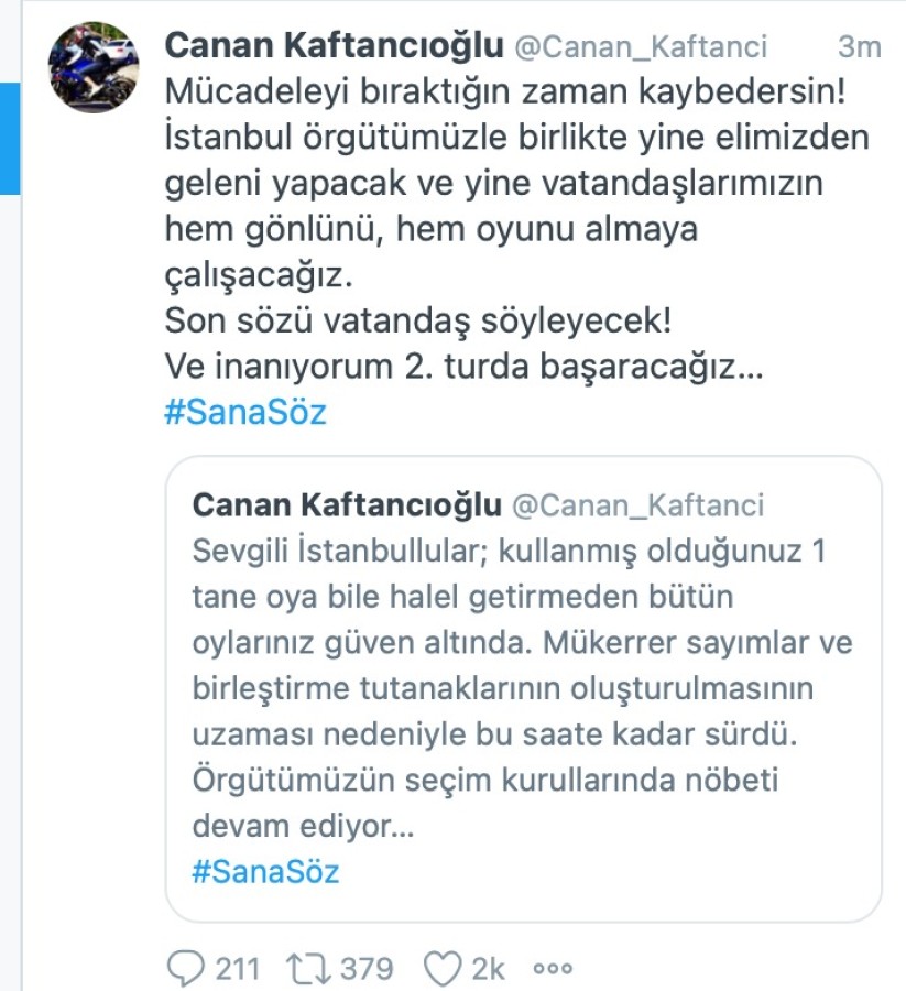 "Mücadeleyi bıraktığın zaman kaybedersin! İstanbul örgütümüzle birlikte yine elimizden geleni yapacak ve yine vatandaşlarımızın hem gönlünü, hem oyunu almaya çalışacağız. Son sözü vatandaş söyleyecek! Ve inanıyorum 2. turda başaracağız..."