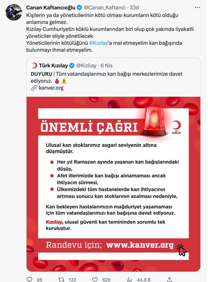 "Kişilerin ya da yöneticilerinin kötü olması kurumların kötü olduğu anlamına gelmez" diyen Kaftancıoğlu, "Kızılay Cumhuriyetin köklü kurumlarından biri olup çok yakında liyakatli yöneticiler eliyle yönetilecek. Yöneticilerinin kötülüğünü Kızılay'a mal etmeyelim kan bağışında bulunmayı ihmal etmeyelim" ifadelerini kullandı.