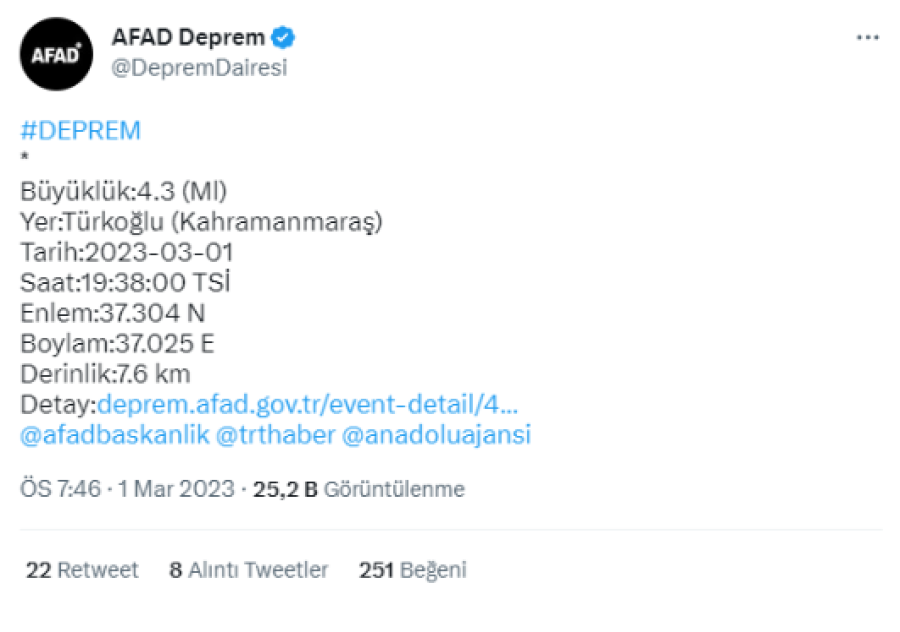 Afet ve Acil Durum Yönetimi (AFAD) Başkanlığı, Kahramanmaraş'ın Türkoğlu ilçesinde bugün saat 19.38'de 4.3 büyüklüğünde ve 7,6 km derinlikte bir deprem meydana geldiğini duyurdu.