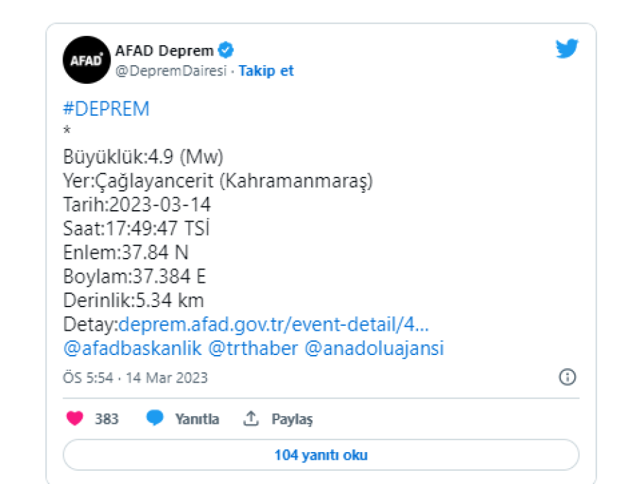 Afet ve Acil Durum Yönetimi Başkanlığının (AFAD) internet sitesinde yer alan bilgiye göre, Kahramanmaraş'ın Çağlayancerit ilçesinde saat 17.49'da 4,9 büyüklüğünde deprem kaydedildi.
