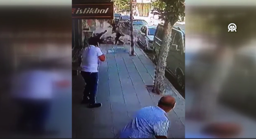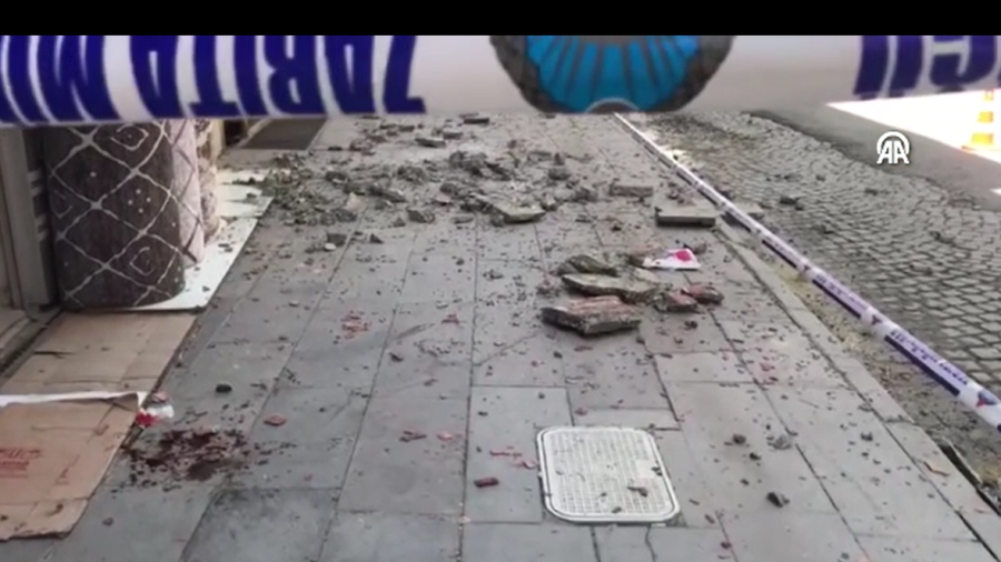 Öte yandan, ailenin cadde üzerinde yürürken binadan kopan beton parçalarının üzerlerine düştüğü anlar güvenlik kameralarınca kaydedildi.