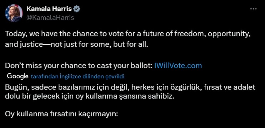 Harris, söz konusu paylaşımında, "Bugün, sadece bazılarımız için değil, herkes için özgürlük, fırsat ve adalet dolu bir gelecek için oy kullanma şansına sahibiz. Oy kullanma fırsatını kaçırmayın" ifadelerini kullandı.