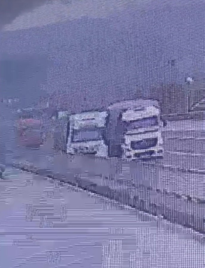 Görüntülerde, kamyonun tırı yoldan çıkartması ve tırın beton bariyerlere çarpması yer alıyor.