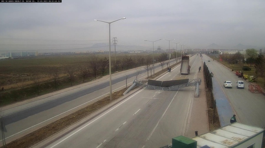 Konya'da sürücü R.Y.'nin kamyondaki hafriyatı boşalttıktan sonra açık unuttuğu damperin çarptığı dijital yön levhası devrildi. O anlar kameralara yansıdı.