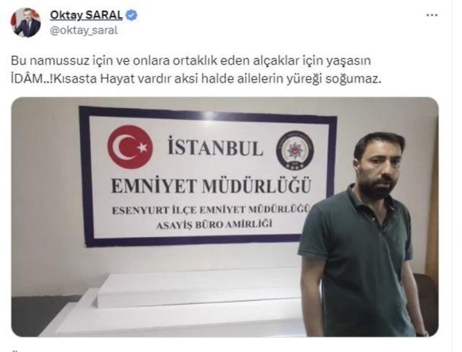 Esenyurt'ta iki kişinin öldüğü tekel bayisindeki silahlı saldırının şüphelilerinden birisi yakalandı. Cumhurbaşkanı Başdanışmanı Oktay Saral da şüphelinin fotoğrafıyla beraber yaptığı paylaşımına, "Bu namussuz için ve onlara ortaklık eden alçaklar için yaşasın idam.! Kısasta Hayat vardır aksi halde ailelerin yüreği soğumaz." notunu düştü.