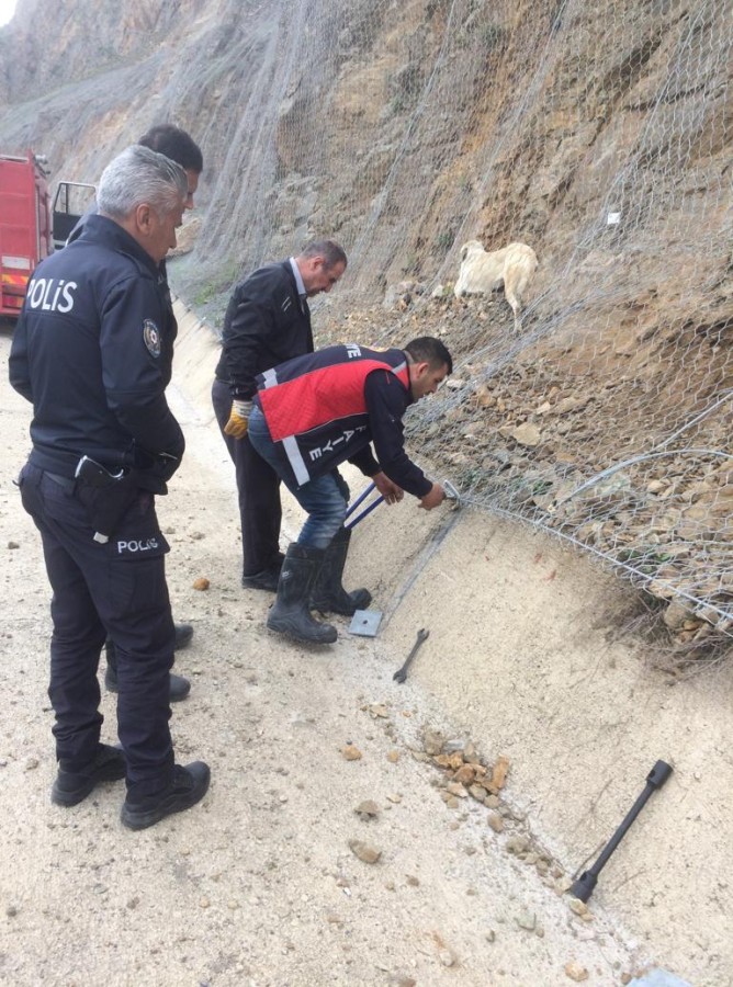 Kara yolunun yanındaki yamaca kaya ve taş düşmesini engellemek için gerilen çelik koruma ağına, sokak köpeği takıldı.