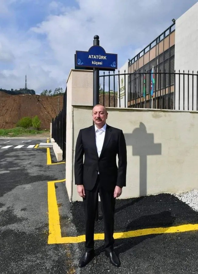 Azerbaycan Cumhurbaşkanı İlham Aliyev, Ermeni işgalinden kurtarılan Karabağ'ın sembol şehri Şuşa'da Atatürk Caddesi'nin açılışını gerçekleştirdi. Atatürk sevgisiyle bilinen Aliyev, caddenin isminin yazılı olduğu levhanın önünde poz verdi.