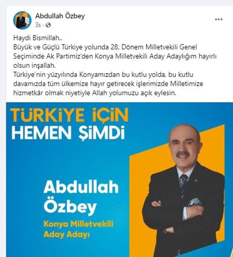 Sözcü'deki habere göre milletvekili aday adaylığına ilişkin sosyal medya hesabından açıklama yapan Abdullah Özbey, "Haydi Bismillah... Büyük ve güçlü Türkiye yolunda 28. Dönem Milletvekili Genel Seçiminde AK Partimiz'den Konya Milletvekili Aday Adaylığım hayırlı olsun inşallah. Türkiye'nin yüzyılında Konya'mızdan bu kutlu yolda, bu kutlu davamızda tüm ülkemize hayır getirecek işlerimizde milletimize hizmetkâr olmak niyetiyle Allah yolumuzu açık eylesin" dedi.