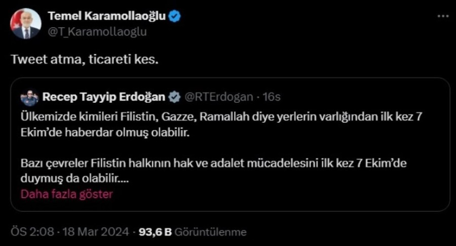 Saadet Partisi lideri Temel Karamollaoğlu, AKP'li Cumhurbaşkanı Erdoğan'ın Gazze paylaşımını alıntılayarak 'Tweet atma, ticareti kes' ifadesinde bulundu.