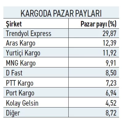 Çinli Alibaba'nın satın aldığı e-ticaret devi Trendyol'un kurduğu Trendyol Express, dört yıl gibi kısa bir sürede pazar payında yerli kargo şirketlerine fark atarak zirveye yerleşti. 2020'de listelerde yer almayan şirket, 2022'de yüzde 20,7'lik pay elde etti. 2023'te yüzde 26,4'e çıkan pay 2024'ün ikinci yarısında yüzde 29,3'e, 2025'in ilk yarısında ise yüzde 29,9'a ulaştı.