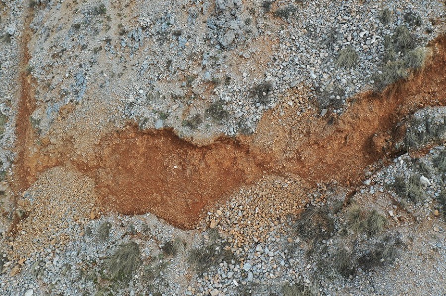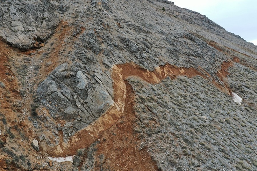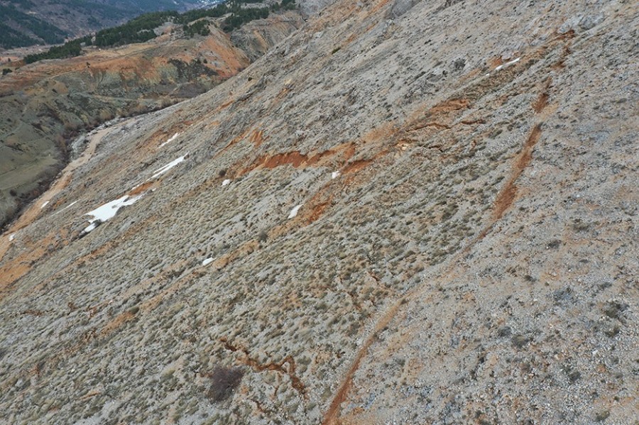 Dağdaki karların erimesiyle ortaya çıkan ve depremin büyüklüğünü gözler önüne seren yarıklar ve çökmeler, dronla görüntülendi.