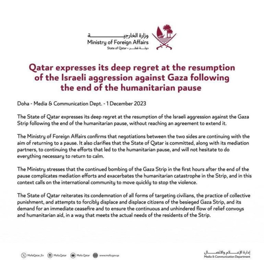 Dışişleri duraklamanın sona ermesiyle birlikte oluşan mevcut durum hakkında, "Bakanlık, duraklamanın sona ermesinden sonraki ilk saatlerde Gazze Şeridi'nin bombalanmaya devam edilmesinin arabuluculuk çabalarını zorlaştırdığını ve Gazze'deki insani felaketi daha da kötüleştirdiğini vurgular ve bu bağlamda uluslararası topluma şiddeti durdurmak için hızlı hareket etme çağrısında bulunur" ifadelerini kullandı.