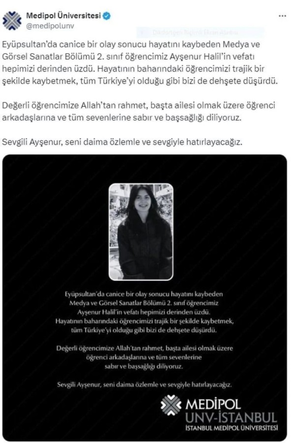 Ayşenur'un öğrencisi olduğu Medipol Üniversitesi, resmi sosyal medya hesabından Ayşenur Halil için bir taziye mesajı yayınlamıştı.