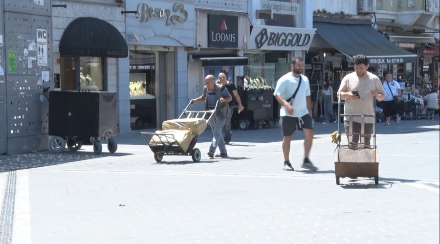 Özellikle dönerci, fırın, hamal gibi meslekleri yapanlar sıcak havalarda bir hayli zorlanıyor. İstanbul'da Kapalıçarşı ve Eminönü çevresinde arabaların giremediği sokaklarda yük taşıyan hamalların zorlu mesaisi görüntülendi.