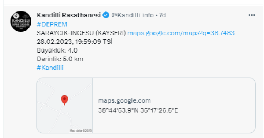 Kayseri'de 4 büyüklüğünde deprem meydana geldi.