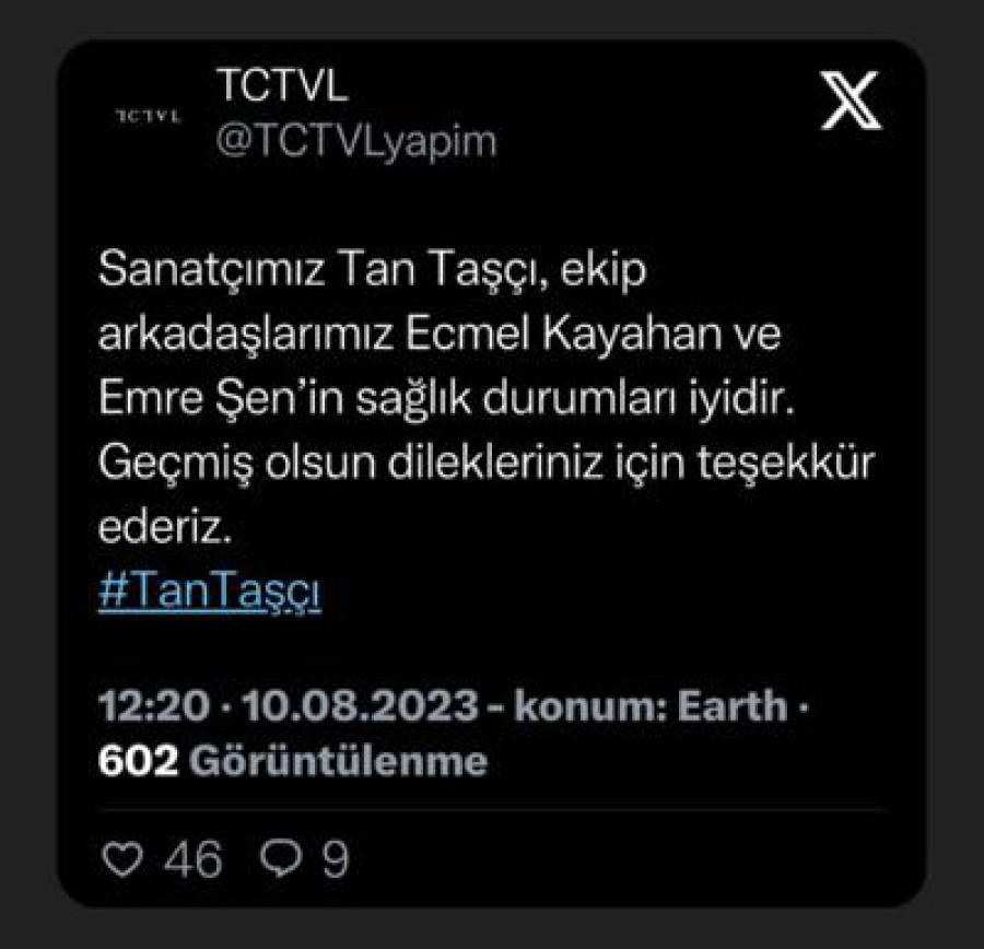Açıklamada, "Sanatçımız Tan Taşçı, ekip arkadaşlarımız Ecmel Kayahan ve Emre Şen'in sağlık durumları iyidir. Geçmiş olsun dilekleriniz için teşekkür ederiz" denildi.