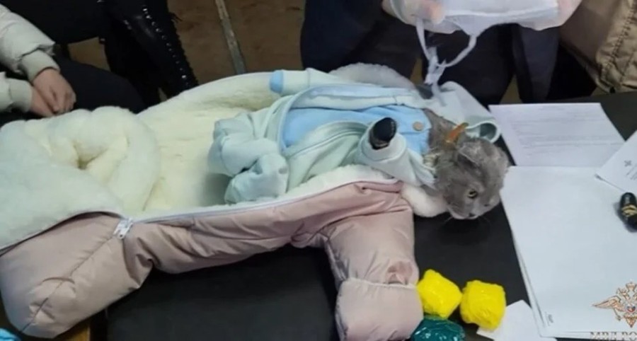 İçişleri Bakanlığı sözcüsü Irina Volk, " Uyuşturucu satıcısının elinde taşıdığı bir evcil kedisi vardı ve yeni doğan kıyafetleri giyiyordu" ifadelerini kullandı.
