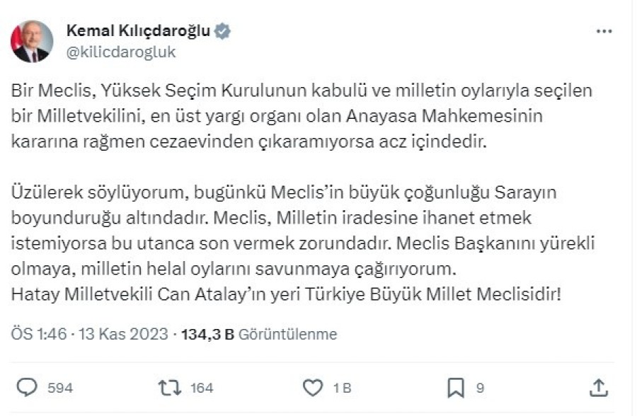 "Bir Meclis, Yüksek Seçim Kurulunun kabulü ve milletin oylarıyla seçilen bir Milletvekilini, en üst yargı organı olan Anayasa Mahkemesinin kararına rağmen cezaevinden çıkaramıyorsa acz içindedir. Üzülerek söylüyorum, bugünkü Meclis'in büyük çoğunluğu Sarayın boyunduruğu altındadır. Meclis, Milletin iradesine ihanet etmek istemiyorsa bu utanca son vermek zorundadır. Meclis Başkanını yürekli olmaya, milletin helal oylarını savunmaya çağırıyorum. Hatay Milletvekili Can Atalay'ın yeri Türkiye Büyük Millet Meclisidir!"