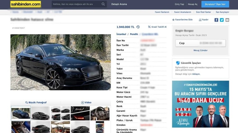 Millet İttifakı'nın Cumhurbaşkanı Adayı ve CHP Genel Başkanı Kemal Kılıçdaroğlu, e-ticaret sitesi sahibinden.com'da araç ilanlarına reklam verdiğini paylaştı.