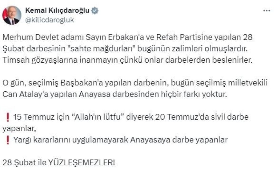 "28 Şubat'ta seçilmiş başbakana yapılan darbenin Can Atalay'a yapılan anayasa darbesinden farkı olmadığını" söyleyen Kılıçdaroğlu'nun ifadeleri şöyle: