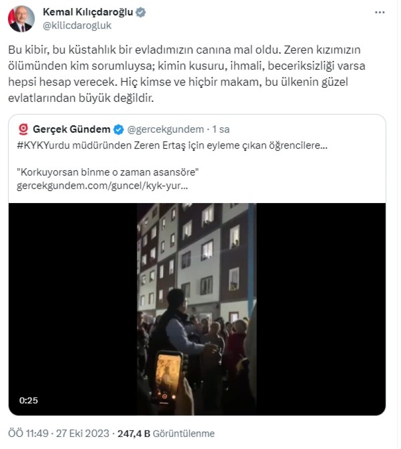 Kılıçdaroğlu, Aydın'da Kredi Yurtlar Kurumu'na ait Güzelhisar Kız Öğrenci Yurdu'nda kalan üniversite öğrencisi Zeren Ertaş'ın, asansör kazasında hayatını kaybetmesiyle ilgili paylaşımda bulundu.