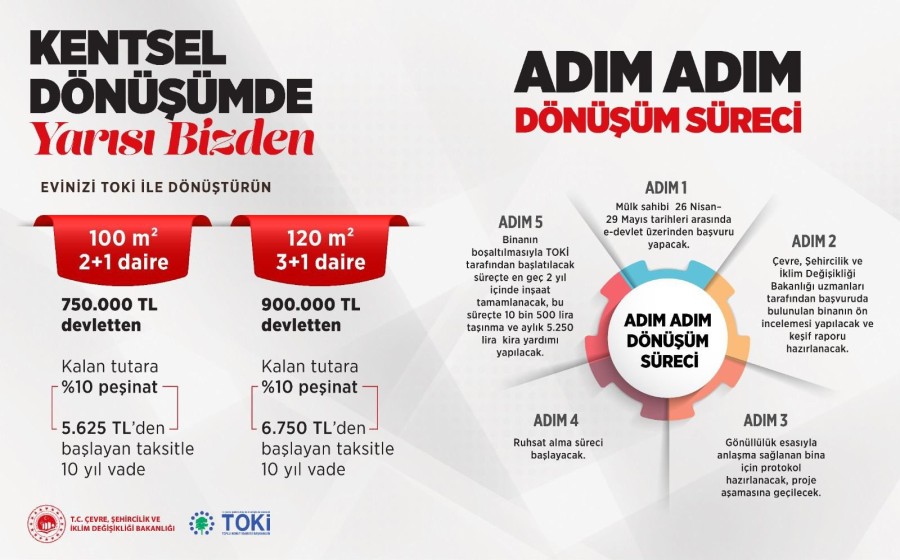 Adım 5 - Binanın boşaltılmasıyla TOKİ tarafından başlatılacak süreçte en geç 2 yıl içinde inşaat tamamlanacak, bu süreçte 10 bin 500 lira taşınma ve aylık 5 bin 250 lira kira yardımı yapılacak."