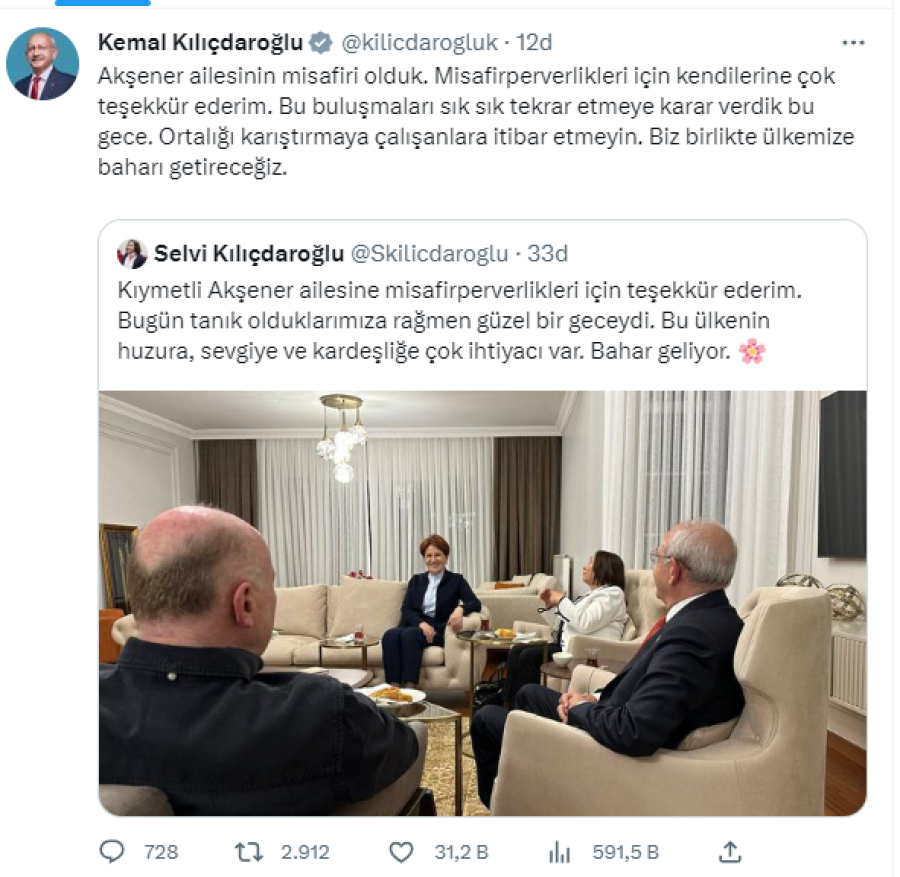 Selvi Kılıçdaroğlu, Twitter hesabından bu akşam bir mesaj yayımladı ve Kemal Kılıçdaroğlu ile birlikte İYİ Parti Genel Başkanı Meral Akşener'i bugün evinde ziyaret ettiklerini duyurdu. Selvi Kılıçdaroğlu; Kemal Kılıçdaroğlu, Meral Akşener ve Tuncer Akşener'in bulunduğu fotoğrafı şu notla birlikte yayınladı: