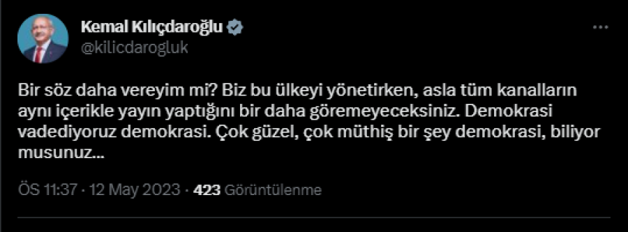 Millet İttifakı'nın Cumhurbaşkanı adayı Kemal Kılıçdaroğlu, Cumhurbaşkanı ve AK Parti Genel Başkanı Recep Tayyip Erdoğan'ın bugün farklı kanallardan ortak yayınlanan söyleşisine ilişkin olarak sosyal medya hesabından yaptığı açıklamada, "Biz bu ülkeyi yönetirken, asla tüm kanalların aynı içerikle yayın yaptığını bir daha göremeyeceksiniz." ifadesini kullandı.