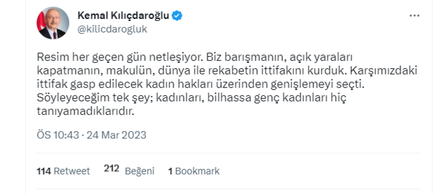 "Resim her geçen gün netleşiyor. Biz barışmanın, açık yaraları kapatmanın, makulün, dünya ile rekabetin ittifakını kurduk. Karşımızdaki ittifak gasp edilecek kadın hakları üzerinden genişlemeyi seçti. Söyleyeceğim tek şey; kadınları, bilhassa genç kadınları hiç tanıyamadıklarıdır."