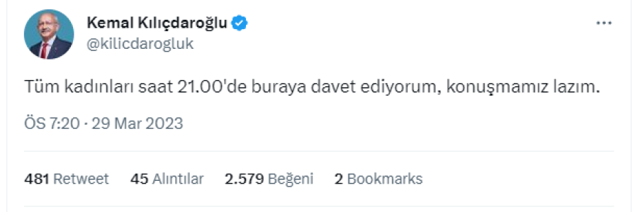 Millet İttifakı'nın cumhurbaşkanı adayı ve CHP Genel Başkanı Kemal Kılıçdaroğlu, "Tüm kadınları saat 21.00'de buraya davet ediyorum, konuşmamız lazım." dedi.