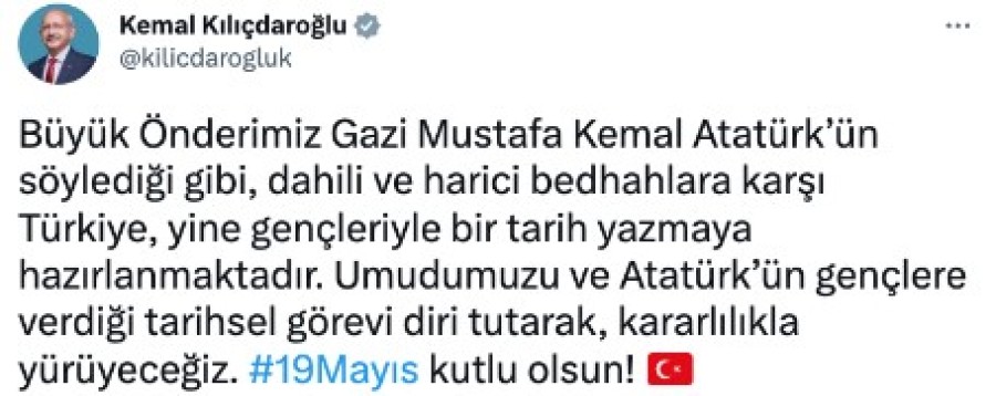 Kemal Kılıçdaroğlu, sosyal medya hesabından yaptığı paylaşım ile, 19 Mayıs Atatürk'ü Anma, Gençlik ve Spor Bayramı'nı kutladı. Kılıçdaroğlu, paylaşımında şu ifadelere yer verdi: