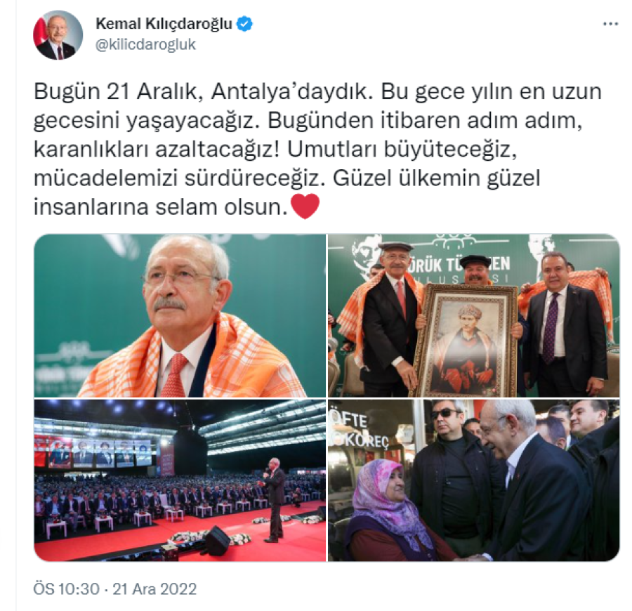 "Bugün 21 Aralık, Antalya'daydık. Bu gece yılın en uzun gecesini yaşayacağız. Bugünden itibaren adım adım, karanlıkları azaltacağız! Umutları büyüteceğiz, mücadelemizi sürdüreceğiz. Güzel ülkemin güzel insanlarına selam olsun."