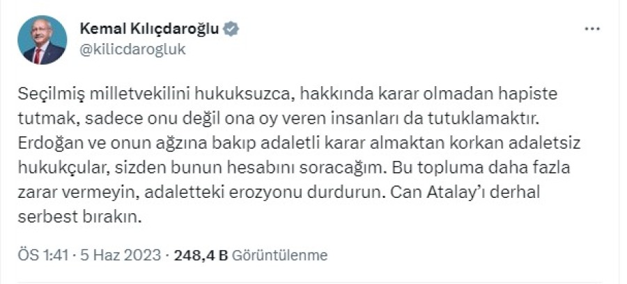 Sosyal medya hesabından, hukukçulara çağrı yapan CHP Genel Başkanı Kemal Kılıçdaroğlu, "Seçilmiş milletvekilini hukuksuzca, hakkında karar olmadan hapiste tutmak, sadece onu değil ona oy veren insanları da tutuklamaktır. Erdoğan ve onun ağzına bakıp adaletli karar almaktan korkan adaletsiz hukukçular, sizden bunun hesabını soracağım. Bu topluma daha fazla zarar vermeyin, adaletteki erozyonu durdurun. Can Atalay'ı derhal serbest bırakın" ifadelerini kullandı.