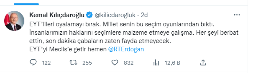 "EYT'lileri oyalamayı bırak. Millet senin bu seçim oyunlarından bıktı. İnsanlarımızın haklarını seçimlere malzeme etmeye çalışma. Her şeyi berbat ettin, son dakika çabaların zaten fayda etmeyecek. EYT'yi Meclis'e getir hemen @RTErdogan"