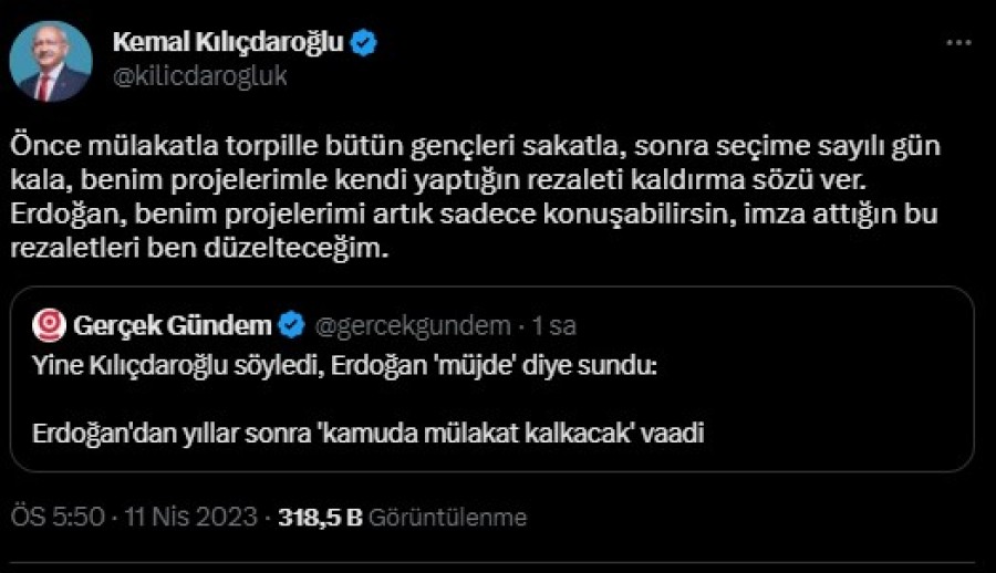 Kılıçdaroğlu, sosyal medya hesabından Erdoğan'a yanıt verdi. Erdoğan'ın seçim beyanname haberini Twitter'dan alıntılayan Kılıçdaroğlu, "Önce mülakatla torpille bütün gençleri sakatla, sonra seçime sayılı gün kala, benim projelerimle kendi yaptığın rezaleti kaldırma sözü ver. Erdoğan, benim projelerimi artık sadece konuşabilirsin, imza attığın bu rezaletleri ben düzelteceğim" dedi.