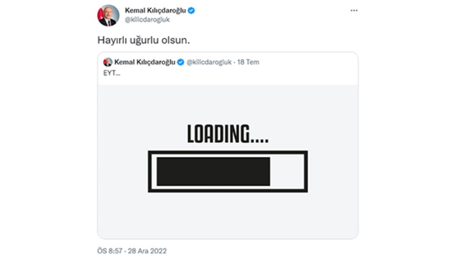 CHP Genel Başkanı Kemal Kılıçdaroğlu, Cumhurbaşkanı ve AK Parti Genel Başkanı Recep Tayyip Erdoğan'ın, Emeklilikte Yaşa Takılanlar (EYT) düzenlemesine ilişkin yaptığı açıklama sonrasında sosyal medya hesabından, "Hayırlı uğurlu olsun" mesajını paylaştı.