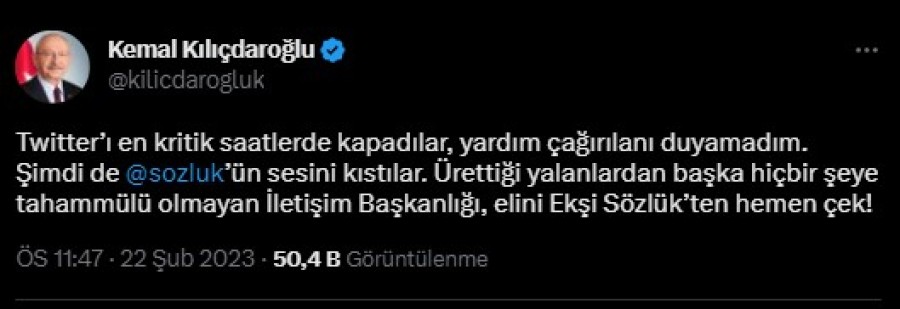 "Twitter'ı en kritik saatlerde kapadılar, yardım çağırılanı duyamadım. Şimdi de Ekşi Sözlük'ün sesini kıstılar. Ürettiği yalanlardan başka hiçbir şeye tahammülü olmayan İletişim Başkanlığı, elini Ekşi Sözlük'ten hemen çek!"
