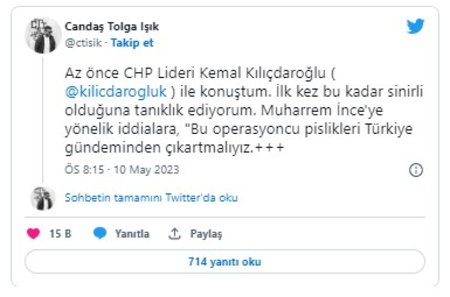 Gazeteci Candan Tolga Işık, Kemal Kılıçdaroğlu'nun Muharrem İnce ile alakalı çıkan kaset iddiaları konusunda çok sert tepki gösterdiğini açıkladı.