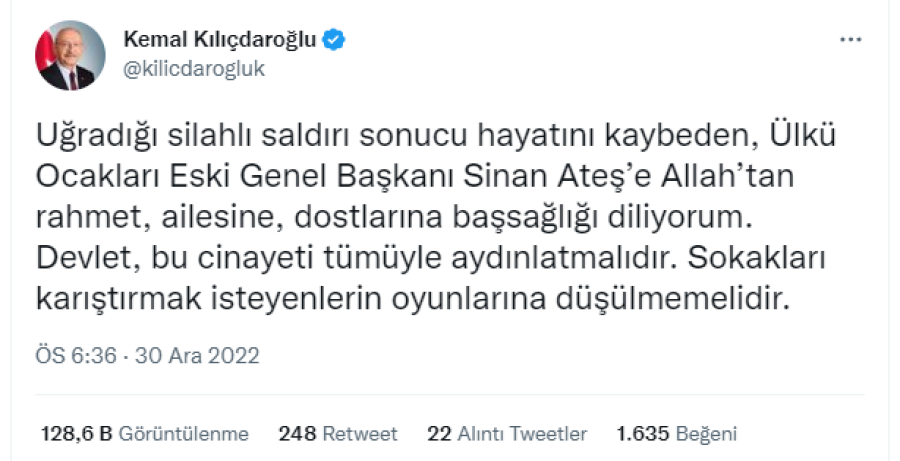 CHP Genel Başkanı Kemal Kılıçdaroğlu, "Uğradığı silahlı saldırı sonucu hayatını kaybeden Ülkü Ocakları eski Genel Başkanı Sinan Ateş'e Allah'tan rahmet; ailesine, dostlarına başsağlığı diliyorum. Devlet, bu cinayeti tümüyle aydınlatmalıdır. Sokakları karıştırmak isteyenlerin oyunlarına düşülmemelidir" dedi.