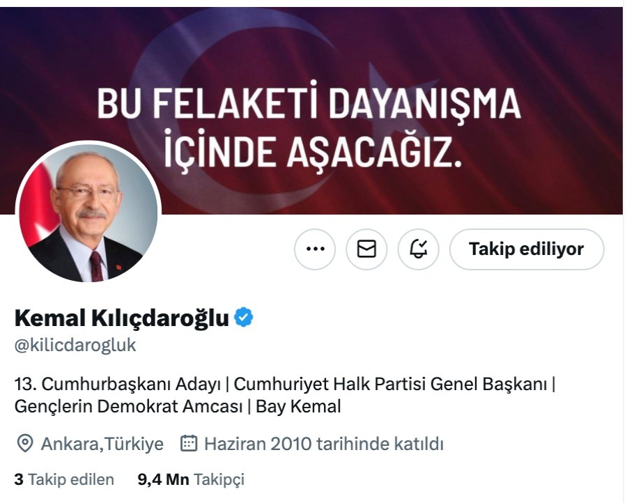 Kılıçdaroğlu'nun Twitter profilinde, "13. Cumhurbaşkanı Adayı | Cumhuriyet Halk Partisi Genel Başkanı | Gençlerin Demokrat Amcası | Bay Kemal" ifadeleri yer aldı.