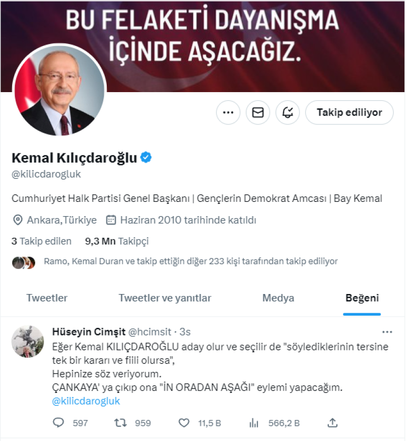 CHP Genel Başkanı Kemal Kılıçdaroğlu, Twitter'dan paylaşım yapan Hüseyin Cimşit isimli avukatın, "Kemal Kılıçdaroğlu seçilir ve söylediklerinin tersine kararlar alırsa Çankaya'da eylem yapacağım" dediği sözleri beğendi.