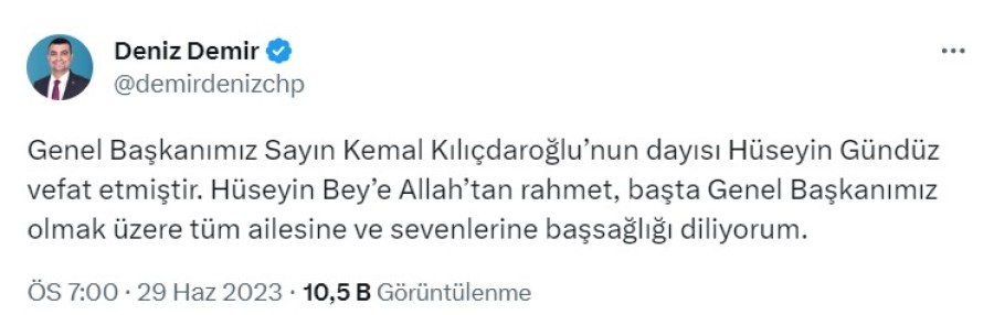 "Genel Başkanımız Sayın Kemal Kılıçdaroğlu'nun dayısı Hüseyin Gündüz vefat etmiştir. Hüseyin Bey'e Allah'tan rahmet, başta Genel Başkanımız olmak üzere tüm ailesine ve sevenlerine başsağlığı diliyorum."