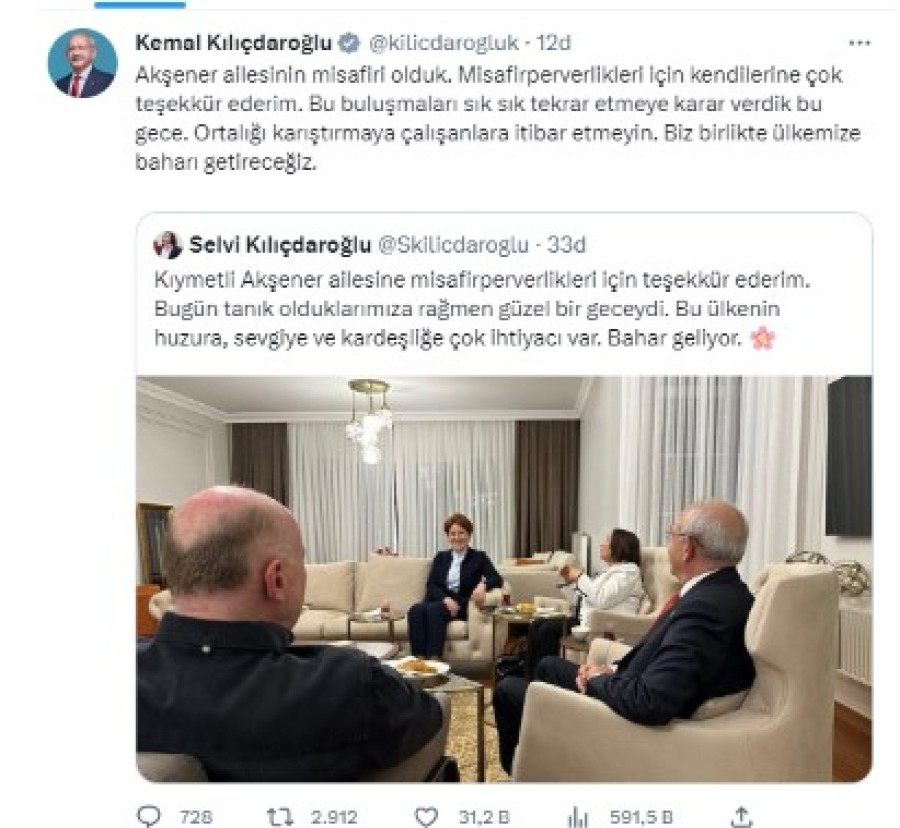 Millet İttifakı Cumhurbaşkanı Adayı ve CHP Genel Başkanı Kemal Kılıçdaroğlu, eşi Selvi Kılıçdaroğlu ile birlikte İyi Parti Genel Başkanı Meral Akşener ve eşini evlerinde ziyaret ettiler. Ziyaretten tek kare fotoğraf paylaşan Selvi Kılıçdaroğlu, "Kıymetli Akşener ailesine misafirperverlikleri için teşekkür ederim. Bugün tanık olduklarımıza rağmen güzel bir geceydi. Bu ülkenin huzura, sevgiye ve kardeşliğe çok ihtiyacı var. Bahar geliyor" mesajını yayınladı.