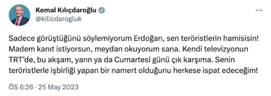 Millet İttifakı Cumhurbaşkanı Adayı ve CHP Genel Başkanı Kemal Kılıçdaroğlu, Cumhur İttifakı cumhurbaşkanı adayı Recep Tayyip Erdoğan'a yaptığı birlikte canlı yayına çıkma teklifini yineleyerek, "Erdoğan, sen teröristlerin hamisisin; madem kanıt istiyorsun, kendi televizyonunda, bu akşam, yarın ya da Cumartesi günü çık karşıma" dedi.
