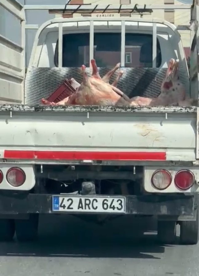 Konya'da kamyonette kilolarca et, üst üste atılıp hijyenik olmayan koşullarda taşındı. Kilolarca etin hijyenik olmayan koşullarda taşınması, trafikte seyreden başka bir sürücü tarafından cep telefonuyla kayda alındı.